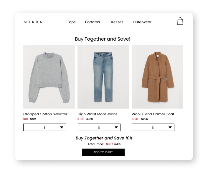 By default, the widget is displayed underneath your product listing details. You also have the option to have the bundles appear as a pop-up when your customer adds an item to their cart.